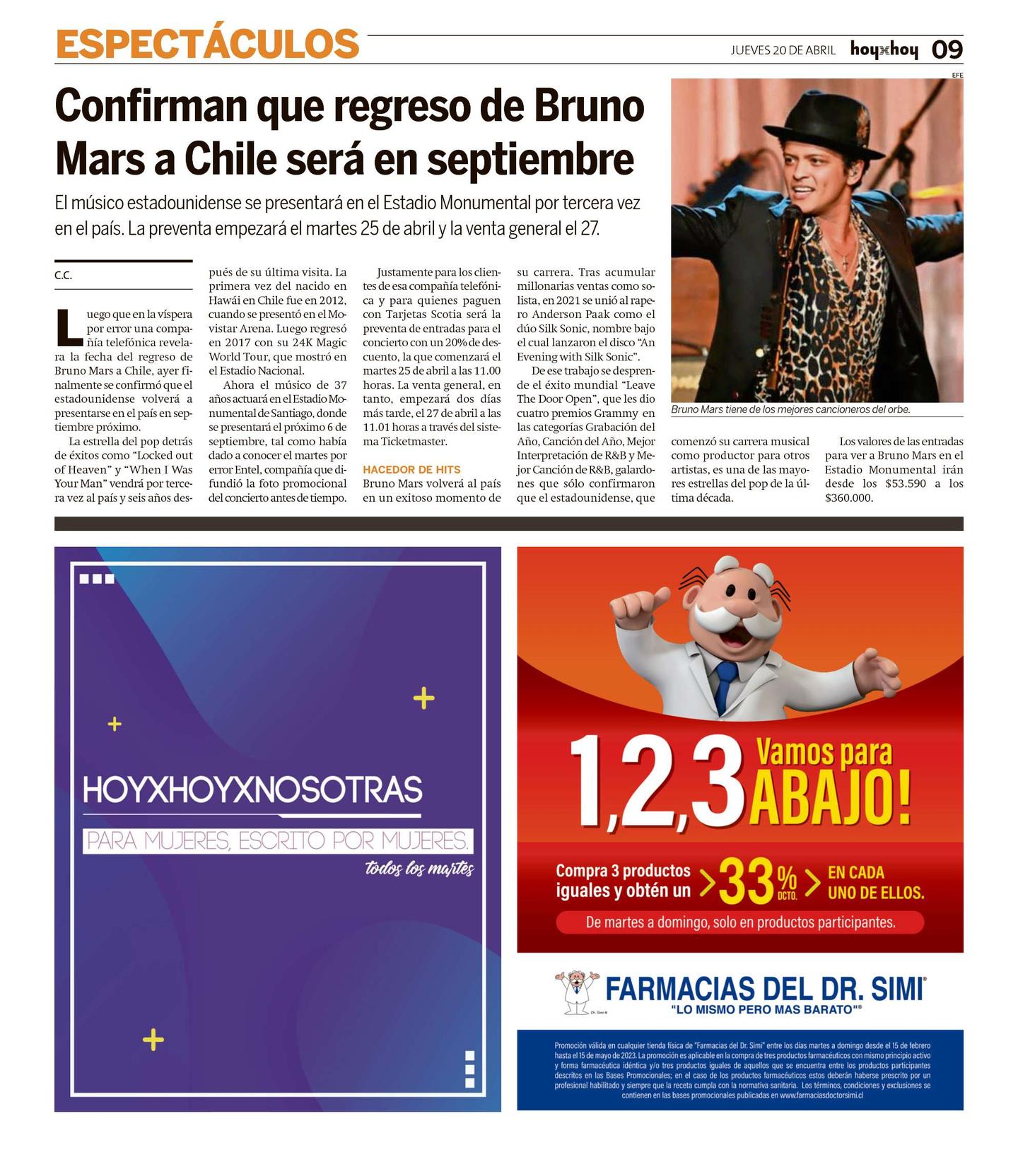 La estrella del pop detrás de éxitos como "Locked out of Heaven" y "When I Was Your Man" vendrá por tercera vez al país y seis años después de su última visita. La primera vez del nacido en Hawái en Chile fue en 2012, cuando se presentó en el Movistar Arena. Luego regresó en 2017 con su 24K Magic World Tour, que mostró en el Estadio Nacional.
