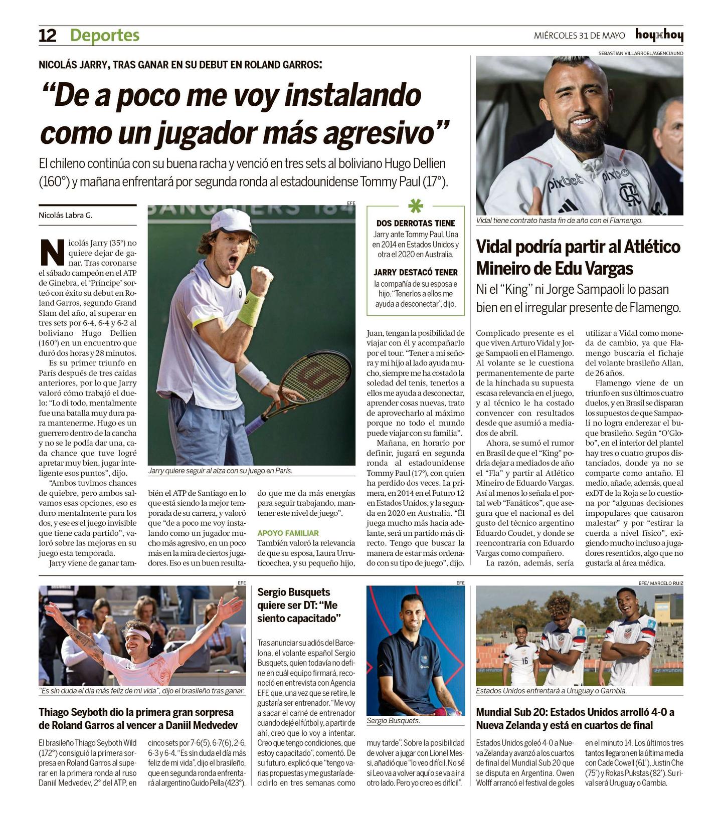 Nicolás Jarry (35°) no quiere dejar de ganar. Tras coronarse el sábado campeón en el ATP de Ginebra, el 'Príncipe' sorteó con éxito su debut en Roland Garros, segundo Grand Slam del año, al superar en tres sets por 6-4, 6-4 y 6-2 al boliviano Hugo Dellien (160°) en un encuentro que duró dos horas y 28 minutos.