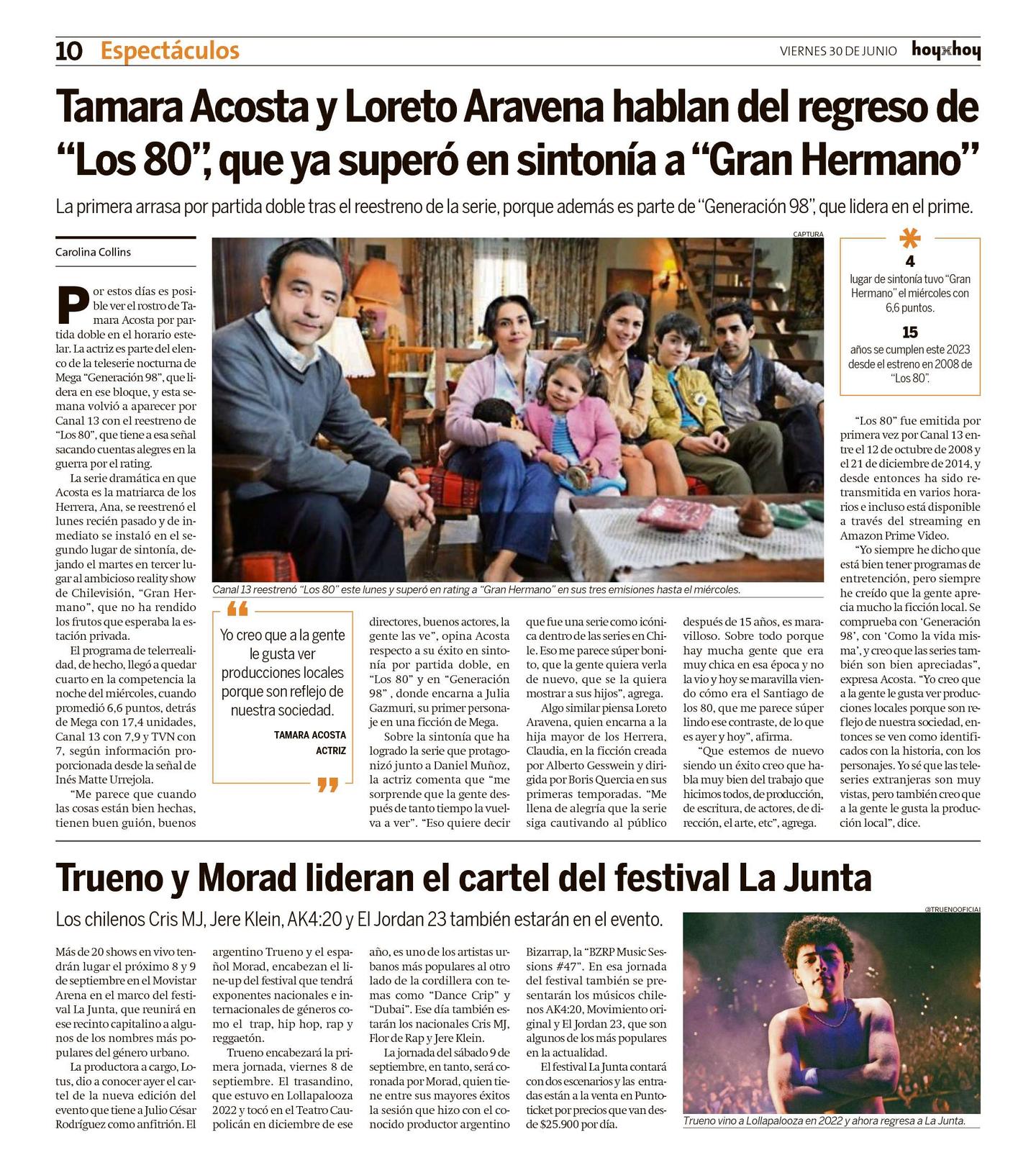 "Me parece que cuando las cosas están bien hechas, tienen buen guión, buenos directores, buenos actores, la gente las ve", opina Acosta respecto a su éxito en sintonía por partida doble, en "Los 80" y en "Generación 98" , donde encarna a Julia Gazmuri, su primer personaje en una ficción de Mega.