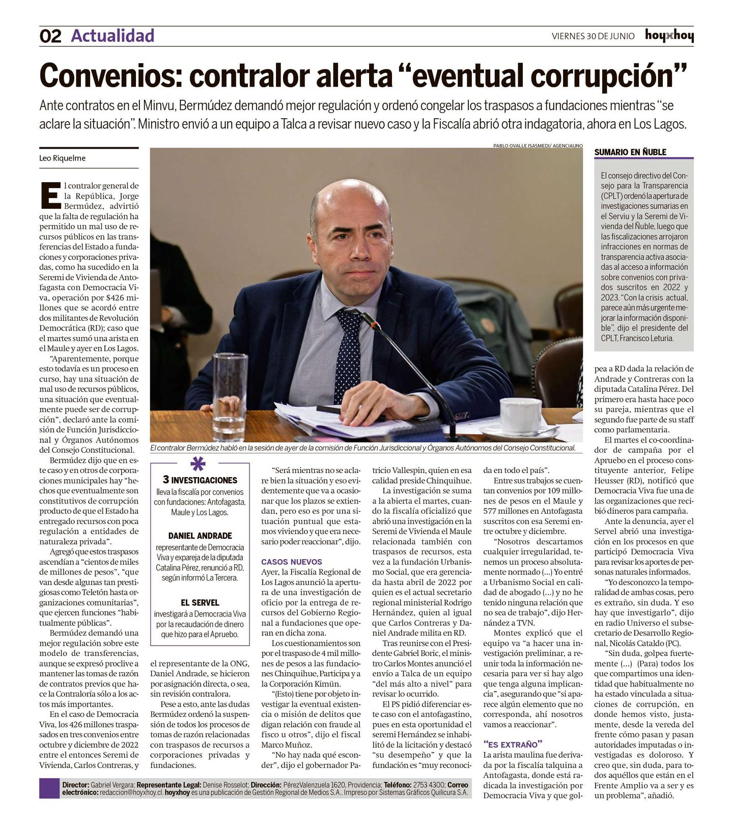 El contralor general de la República, Jorge Bermúdez, advirtió que la falta de regulación ha permitido un mal uso de recursos públicos en las transferencias del Estado a fundaciones y corporaciones privadas, como ha sucedido en la Seremi de Vivienda de Antofagasta con Democracia Viva, operación por $426 millones que se acordó entre dos militantes de Revolución Democrática (RD); caso que el martes sumó una arista en el Maule y ayer en Los Lagos.
