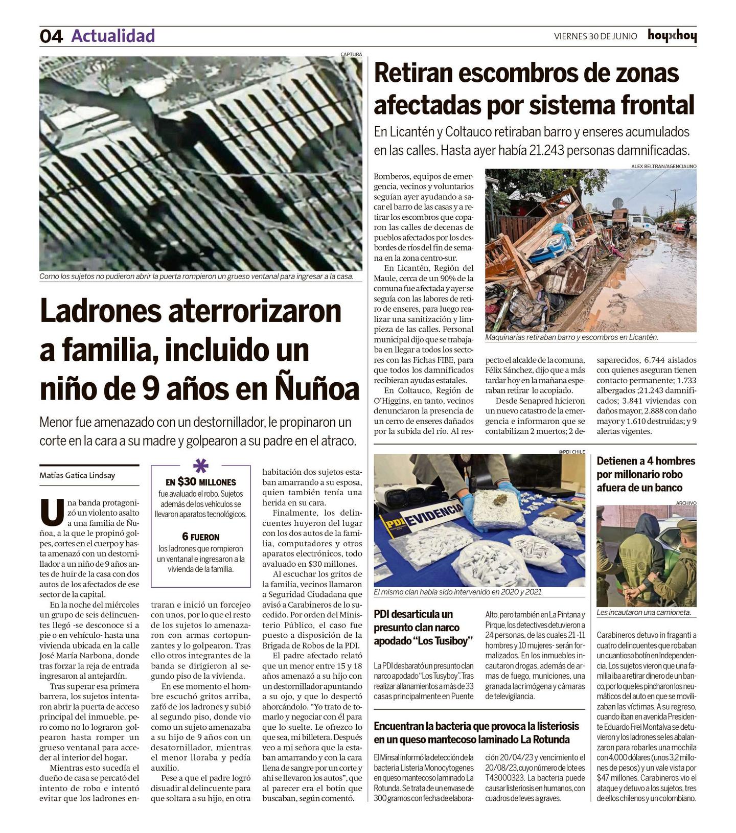 La PDI desbarató un presunto clan narco apodado "Los Tusyboy". Tras realizar allanamientos a más de 33 casas principalmente en Puente Alto, pero también en La Pintana y Pirque, los detectives detuvieron a 24 personas, de las cuales 21 -11 hombres y 10 mujeres- serán formalizados. En los inmuebles incautaron drogas, además de armas de fuego, municiones, una granada lacrimógena y cámaras de televigilancia.