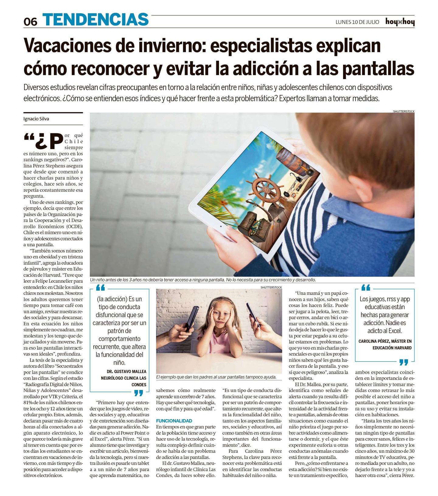 "Primero hay que entender que los juegos de video, redes sociales y app, educativas y de entretención son diseñadas para generar adicción. Nadie es adicto al Power Point o al Excel", alerta Pérez. "Si un alumno tiene que investigar y escribir un artículo, bienvenida la tecnología, pero si nuestra ilusión es pasarle un tablet a a un niño de 7 años para que aprenda matemática, no sabemos cómo realmente aprende un cerebro de 7 años. Hay que saber qué tecnología, con qué fin y para qué edad".