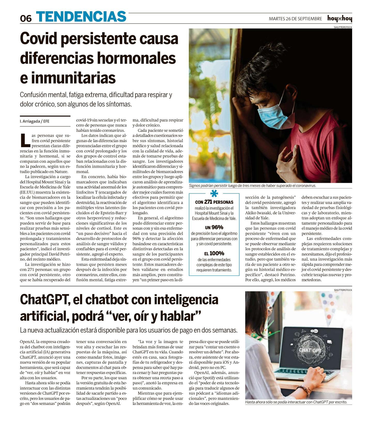 En general, el algoritmo pudo diferenciar entre personas con y sin esa enfermedad con una precisión del 96% y detectar la afección basándose en características distintivas detectadas en la sangre de los participantes en el grupo con covid persistente. Estos marcadores deben validarse en estudios más amplios, pero constituyen "un primer paso en la disección de la patogénesis" del covid persistente, agregó la también investigadora Akiko Iwasaki, de la Universidad de Yale.