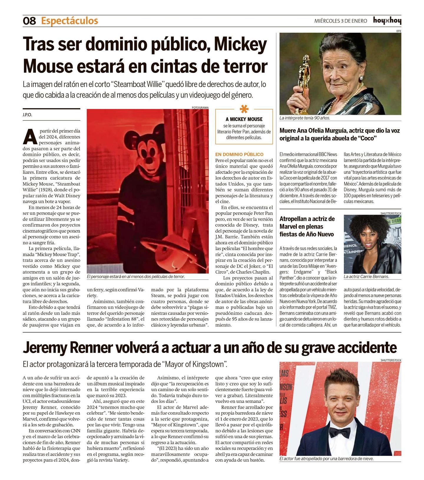A partir del primer día del 2024, diferentes personajes animados pasaron a ser parte del dominio público, es decir, podrán ser usados sin pedir permiso a sus autores o familiares. Entre ellos, se destacó la primera caricatura de Mickey Mouse, "Steamboat Willie" (1928), donde el popular ratón de Walt Disney navega un bote a vapor.