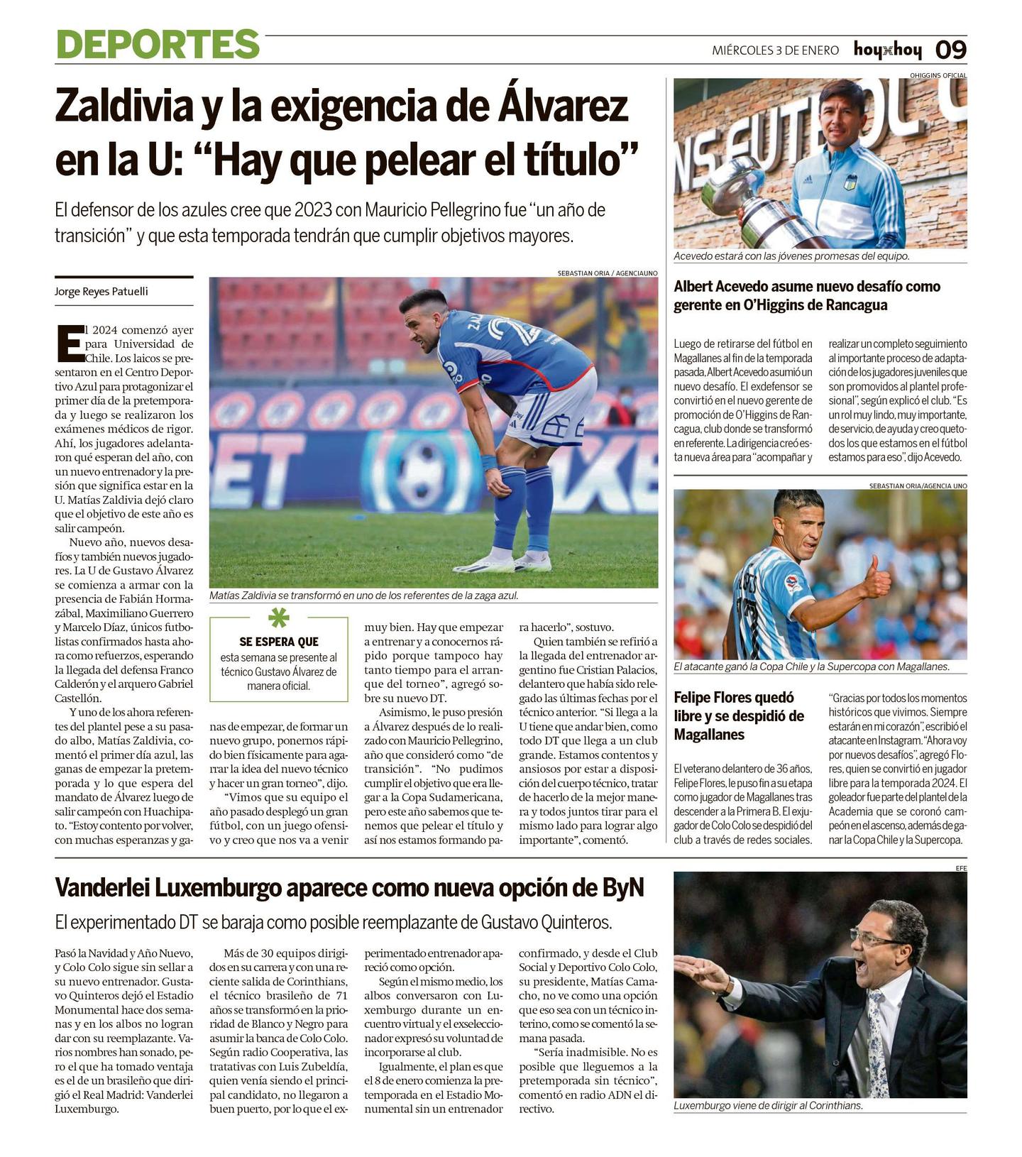 Y uno de los ahora referentes del plantel pese a su pasado albo, Matías Zaldivia, comentó el primer día azul, las ganas de empezar la pretemporada y lo que espera del mandato de Álvarez luego de salir campeón con Huachipato. "Estoy contento por volver, con muchas esperanzas y ganas de empezar, de formar un nuevo grupo, ponernos rápido bien físicamente para agarrar la idea del nuevo técnico y hacer un gran torneo", dijo.