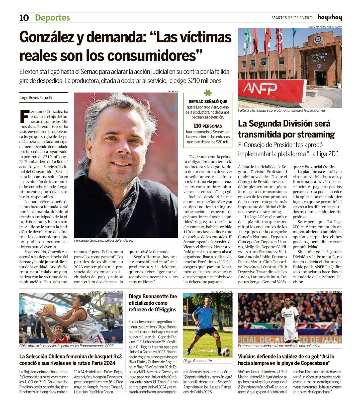 Sorprendido, González se acercó a las dependencias del Sernac y habló junto al director de la entidad, Andrés Herrera, para "colaborar y empatizar con las víctimas de esta situación. Han sido momentos súper difíciles, tanto para ellos como para mí". Los partidos de exhibición en 2023 contemplaban la presencia del extenista en 11 ciudades del país, y solo se concretó en dos de estas, lo que motivó la demanda.
