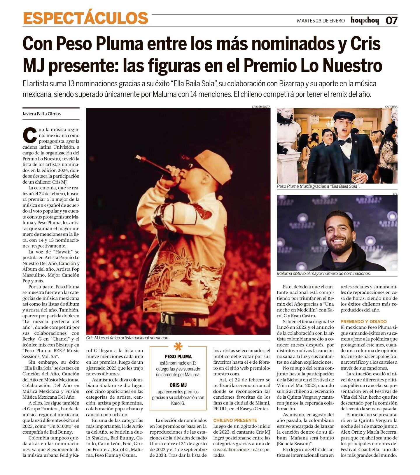 Con la música regional mexicana como protagonista, ayer la cadena latina Univisión, a cargo de la organización del Premio Lo Nuestro, reveló la lista de los artistas nominados en la edición 2024, donde se destaca la participación de un chileno: Cris MJ.