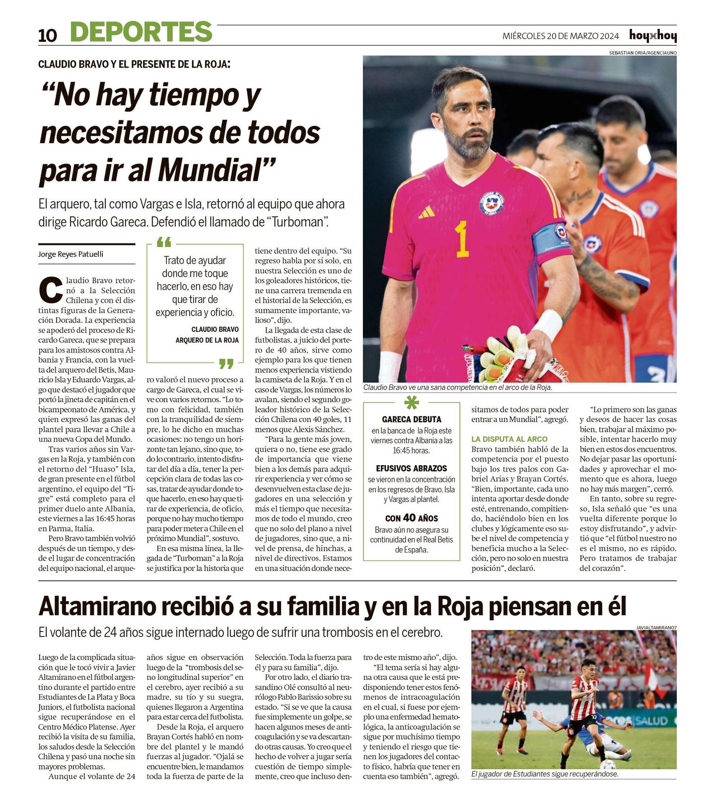 Pero Bravo también volvió después de un tiempo, y desde el lugar de concentración del equipo nacional, el arquero valoró el nuevo proceso a cargo de Gareca, el cual se vive con varios retornos. "Lo tomo con felicidad, también con la tranquilidad de siempre, lo he dicho en muchas ocasiones: no tengo un horizonte tan lejano, sino que, todo lo contrario, intento disfrutar del día a día, tener la percepción clara de todas las cosas, tratar de ayudar donde toque hacerlo, en eso hay que tirar de experiencia, de oficio, porque no hay mucho tiempo para poder meter a Chile en el próximo Mundial", sostuvo.