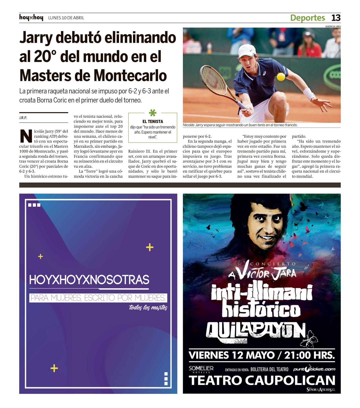 Nicolás Jarry (59° del ranking ATP) debutó con un espectacular triunfo en el Masters 1000 de Montecarlo, y pasó a segunda ronda del torneo, tras vencer al croata Borna Coric (20°) por parciales de 6-2 y 6-3.