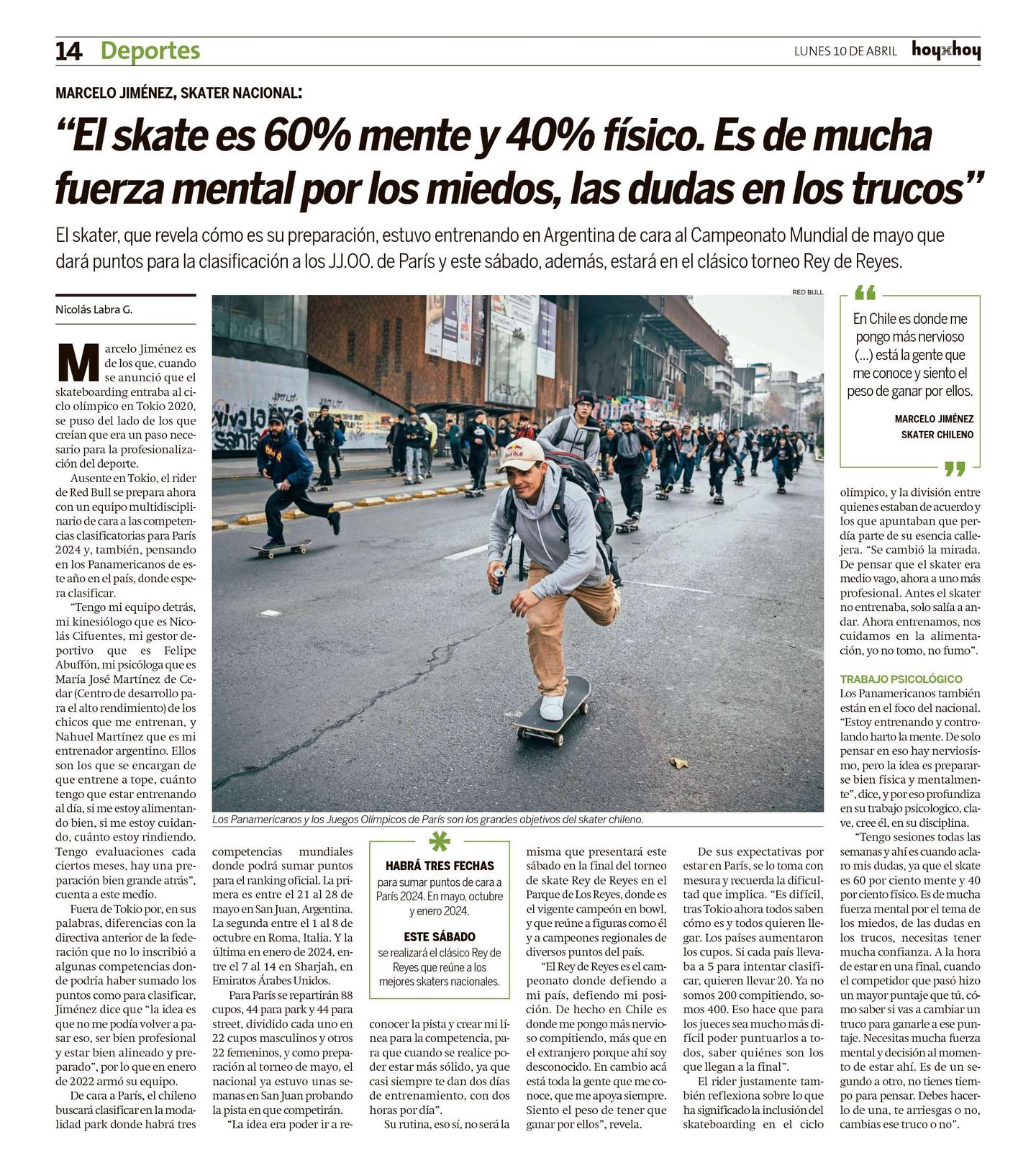 "Tengo sesiones todas las semanas y ahí es cuando aclaro mis dudas, ya que el skate es 60 por ciento mente y 40 por ciento físico. Es de mucha fuerza mental por el tema de los miedos, de las dudas en los trucos, necesitas tener mucha confianza. A la hora de estar en una final, cuando el competidor que pasó hizo un mayor puntaje que tú, cómo saber si vas a cambiar un truco para ganarle a ese puntaje. Necesitas mucha fuerza mental y decisión al momento de estar ahí. Es de un segundo a otro, no tienes tiempo para pensar. Debes hacerlo de una, te arriesgas o no, cambias ese truco o no".