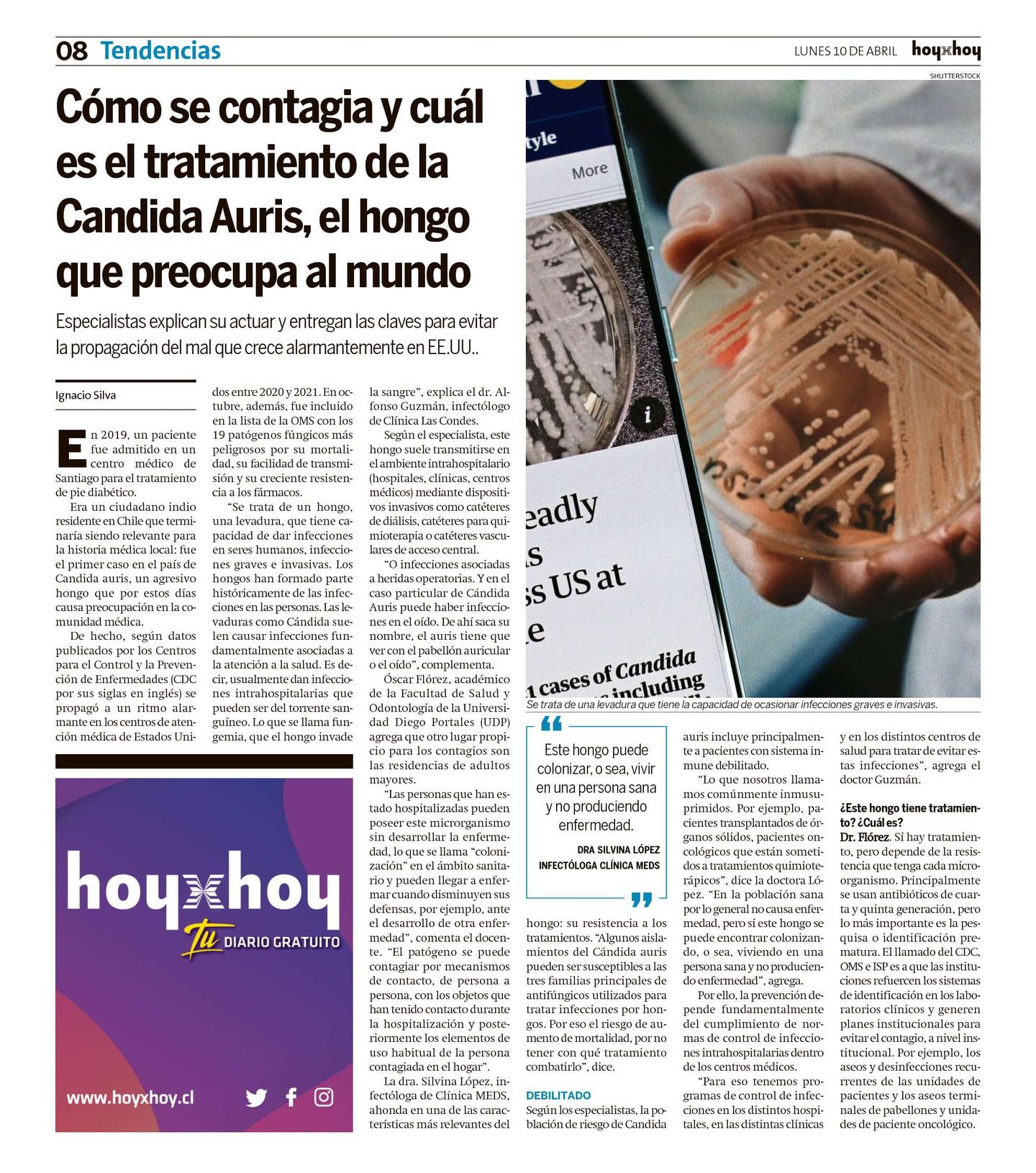 "Se trata de un hongo, una levadura, que tiene capacidad de dar infecciones en seres humanos, infecciones graves e invasivas. Los hongos han formado parte históricamente de las infecciones en las personas. Las levaduras como Cándida suelen causar infecciones fundamentalmente asociadas a la atención a la salud. Es decir, usualmente dan infecciones intrahospitalarias que pueden ser del torrente sanguíneo. Lo que se llama fungemia, que el hongo invade la sangre", explica el dr. Alfonso Guzmán, infectólogo de Clínica Las Condes.