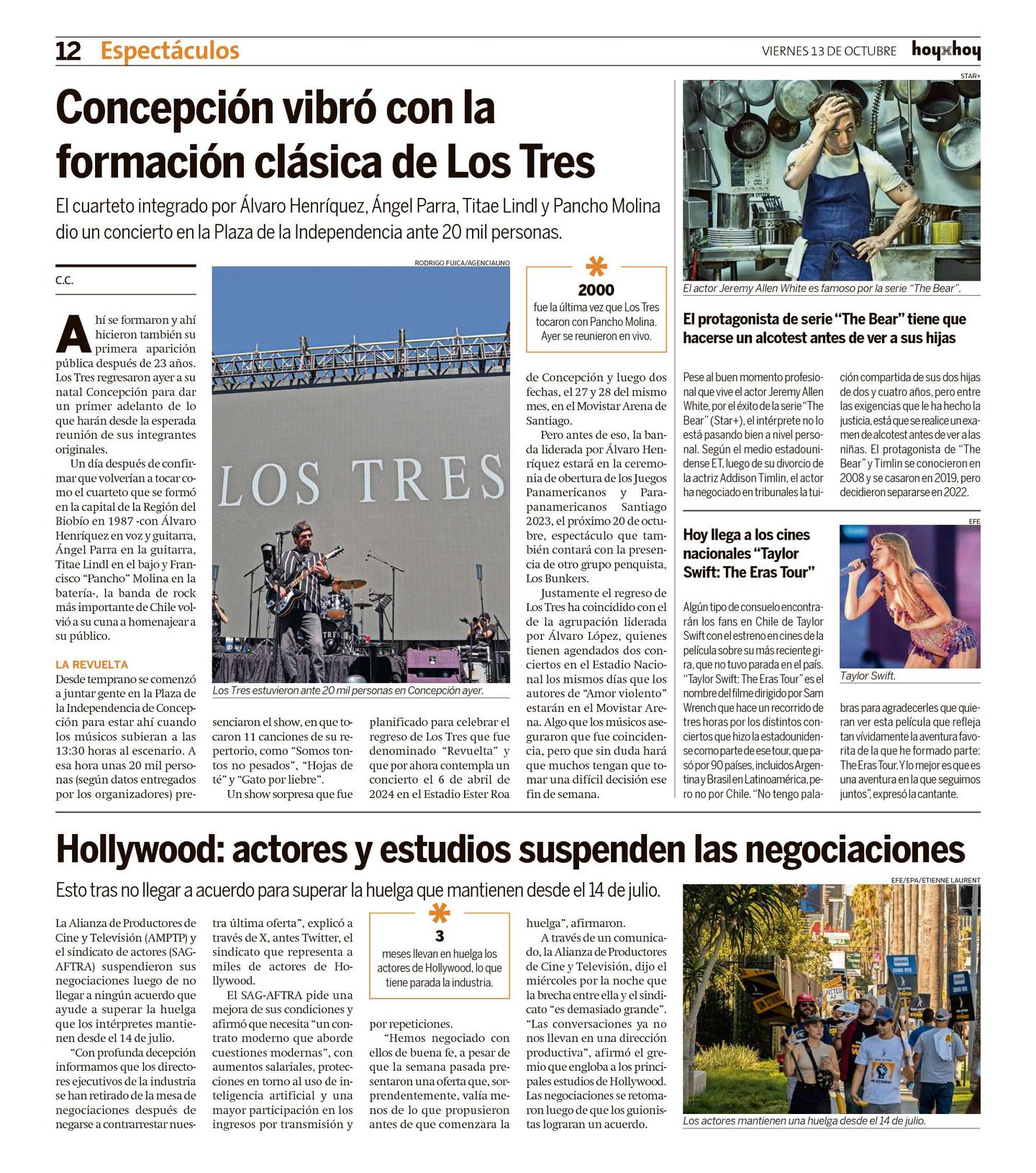 Algún tipo de consuelo encontrarán los fans en Chile de Taylor Swift con el estreno en cines de la película sobre su más reciente gira, que no tuvo parada en el país. "Taylor Swift: The Eras Tour" es el nombre del filme dirigido por Sam Wrench que hace un recorrido de tres horas por los distintos conciertos que hizo la estadounidense como parte de ese tour, que pasó por 90 países, incluidos Argentina y Brasil en Latinoamérica, pero no por Chile. "No tengo palabras para agradecerles que quieran ver esta película que refleja tan vívidamente la aventura favorita de la que he formado parte: The Eras Tour. Y lo mejor es que es una aventura en la que seguimos juntos", expresó la cantante.