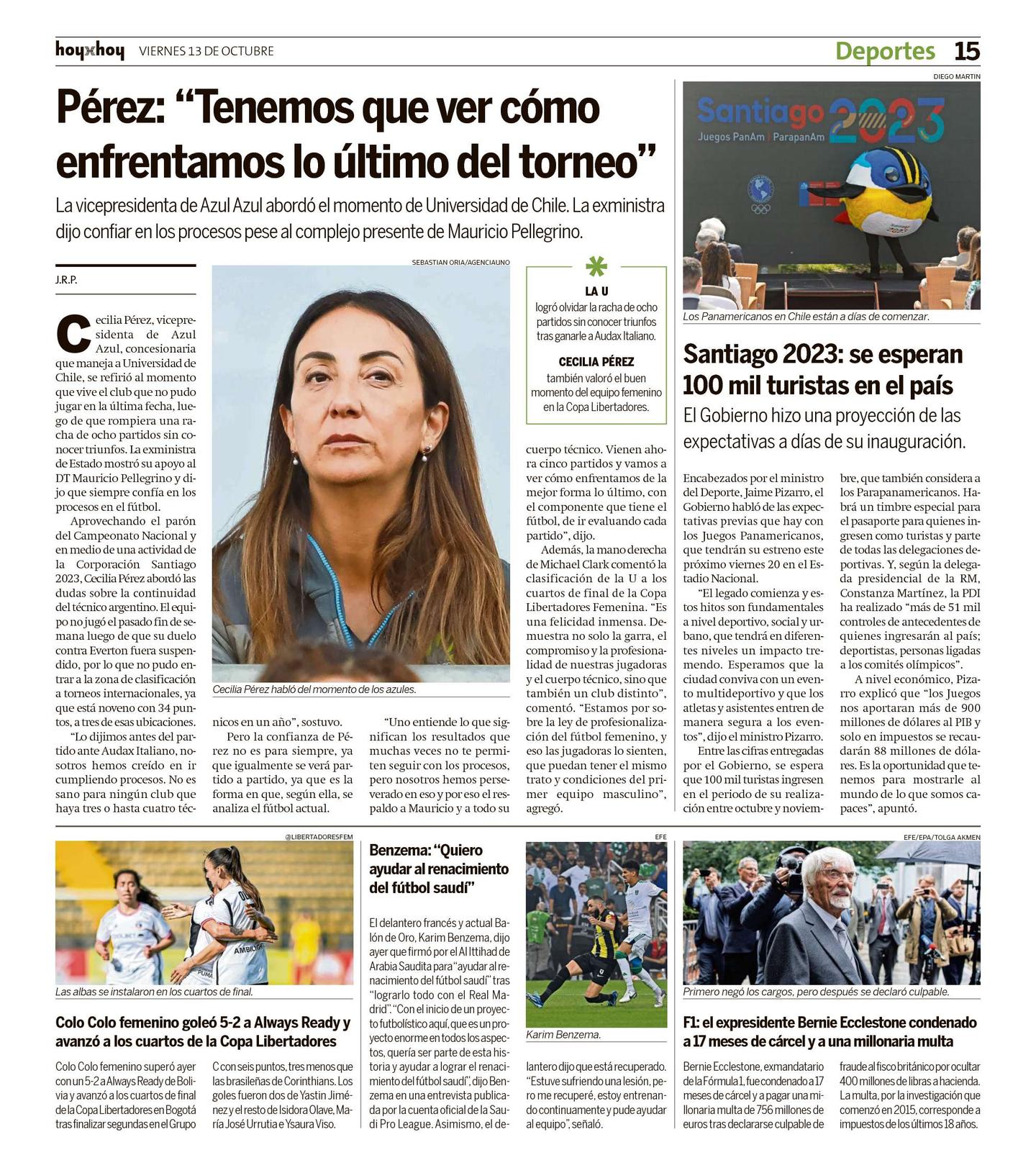 Aprovechando el parón del Campeonato Nacional y en medio de una actividad de la Corporación Santiago 2023, Cecilia Pérez abordó las dudas sobre la continuidad del técnico argentino. El equipo no jugó el pasado fin de semana luego de que su duelo contra Everton fuera suspendido, por lo que no pudo entrar a la zona de clasificación a torneos internacionales, ya que está noveno con 34 puntos, a tres de esas ubicaciones.