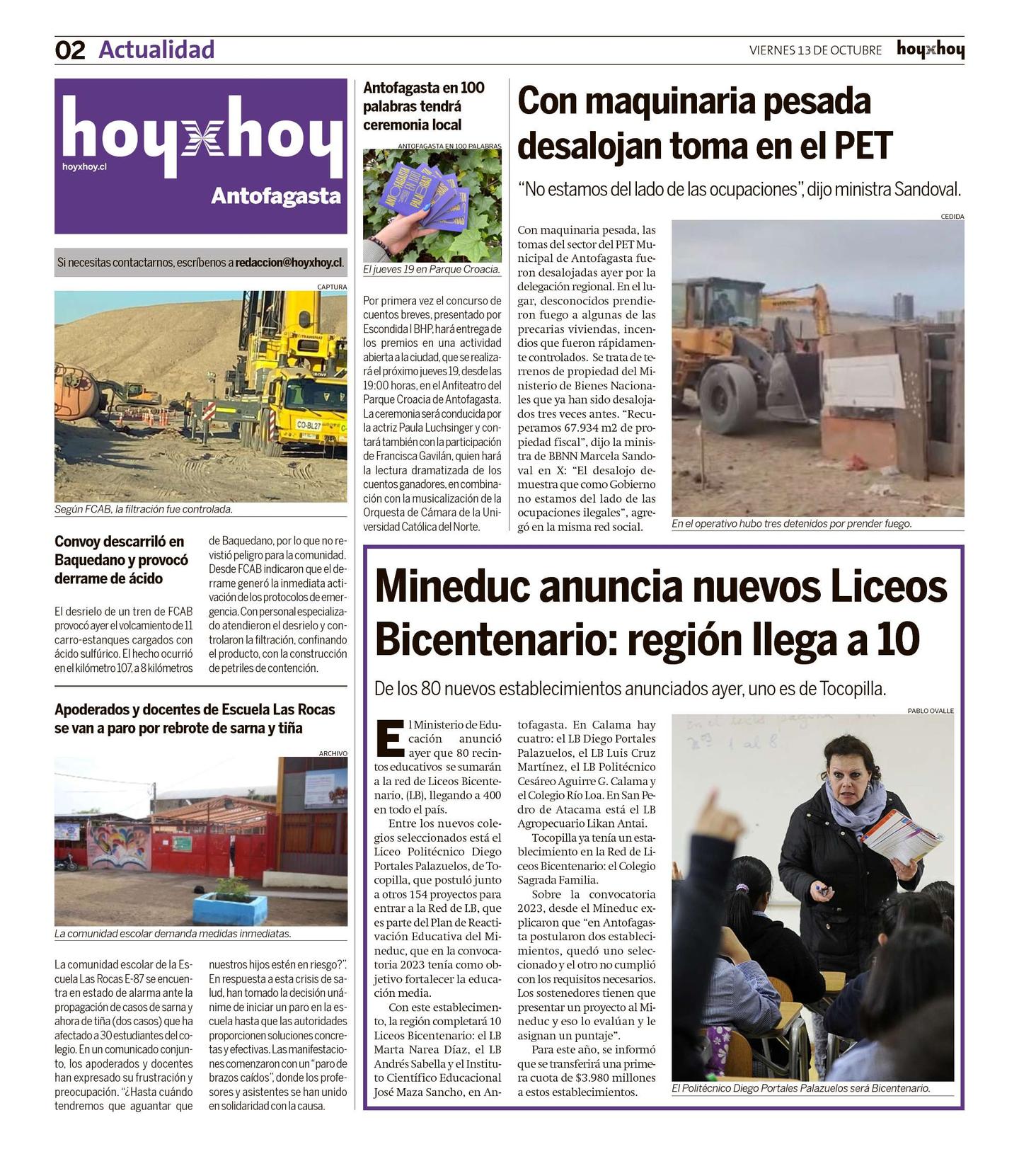 Con maquinaria pesada, las tomas del sector del PET Municipal de Antofagasta fueron desalojadas ayer por la delegación regional. En el lugar, desconocidos prendieron fuego a algunas de las precarias viviendas, incendios que fueron rápidamente controlados. Se trata de terrenos de propiedad del Ministerio de Bienes Nacionales que ya han sido desalojados tres veces antes. "Recuperamos 67.934 m2 de propiedad fiscal", dijo la ministra de BBNN Marcela Sandoval en X: "El desalojo demuestra que como Gobierno no estamos del lado de las ocupaciones ilegales", agregó en la misma red social.
