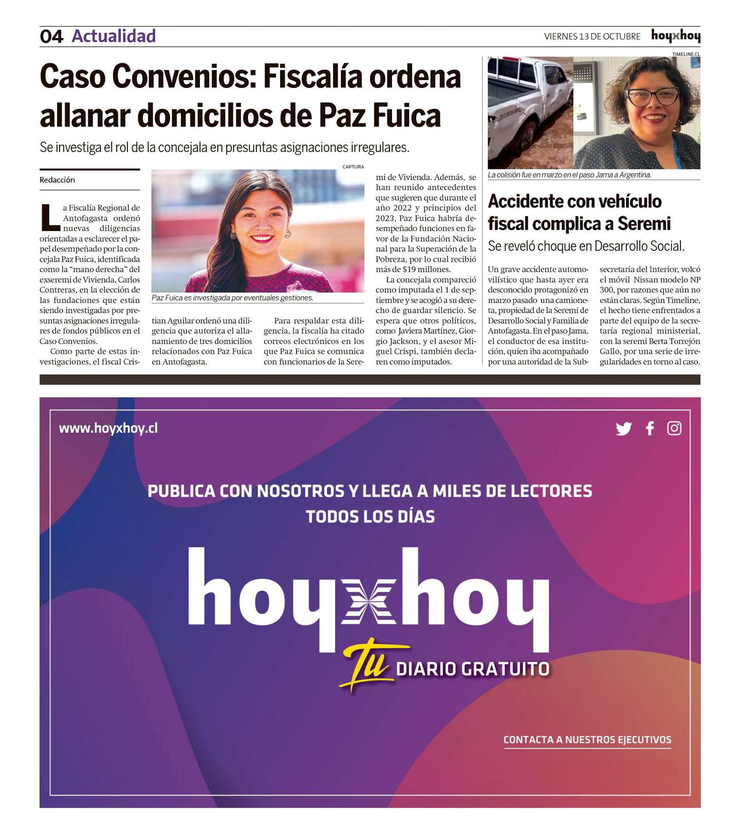 Para respaldar esta diligencia, la fiscalía ha citado correos electrónicos en los que Paz Fuica se comunica con funcionarios de la Seremi de Vivienda. Además, se han reunido antecedentes que sugieren que durante el año 2022 y principios del 2023, Paz Fuica habría desempeñado funciones en favor de la Fundación Nacional para la Superación de la Pobreza, por lo cual recibió más de $19 millones.